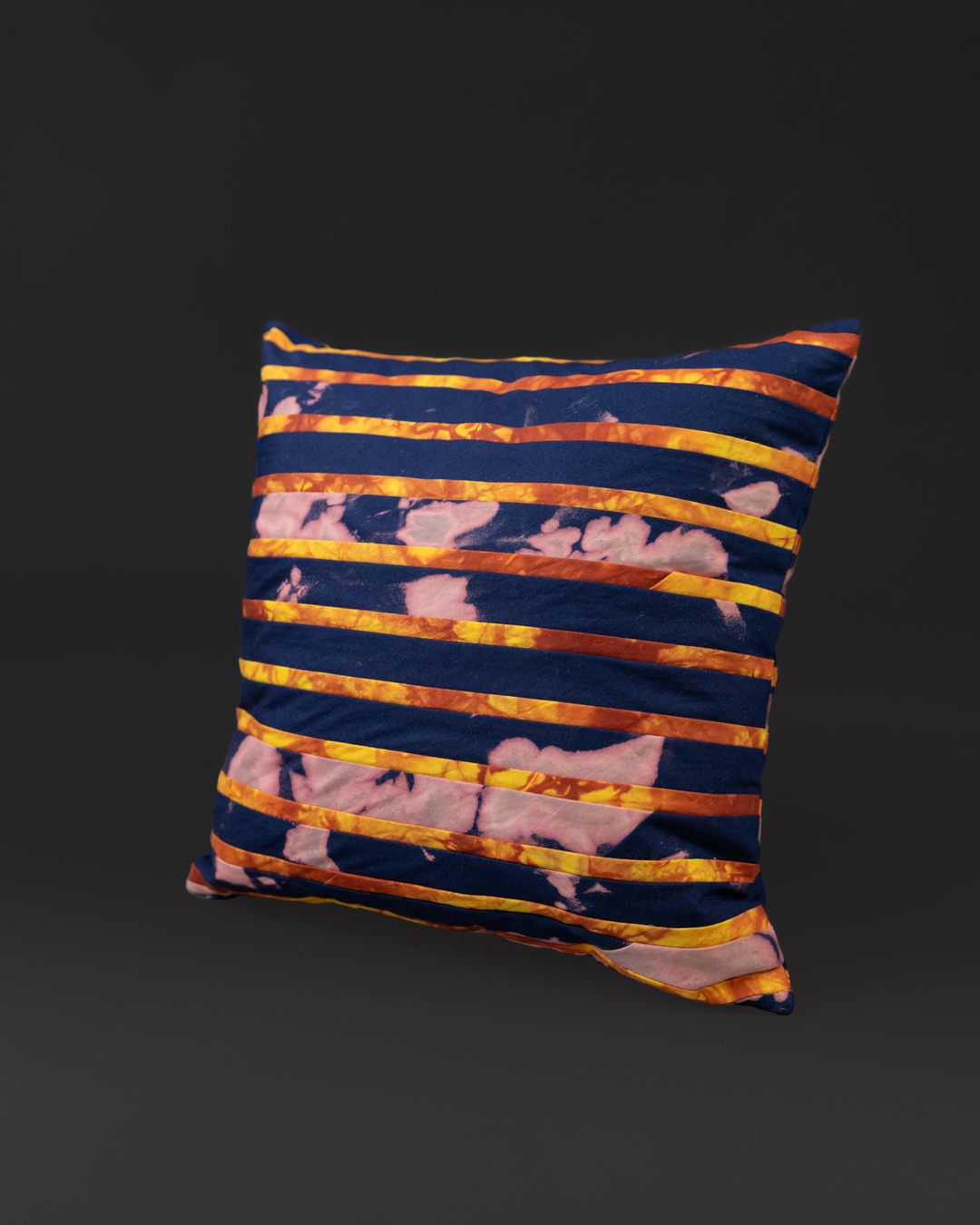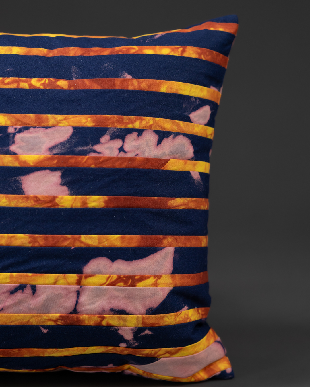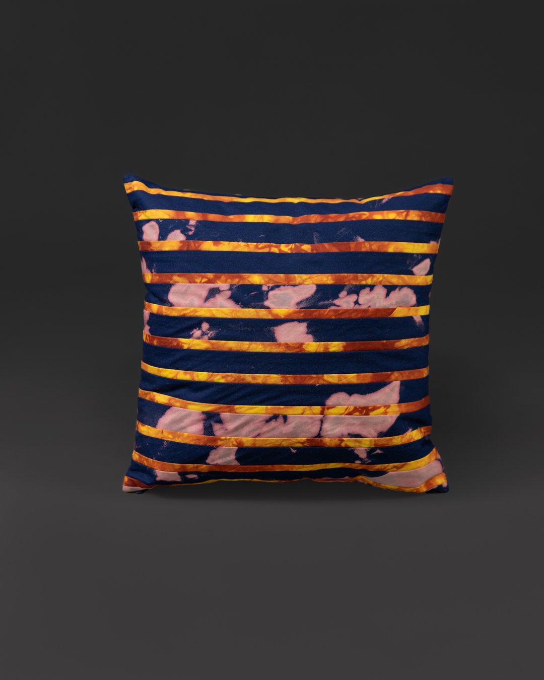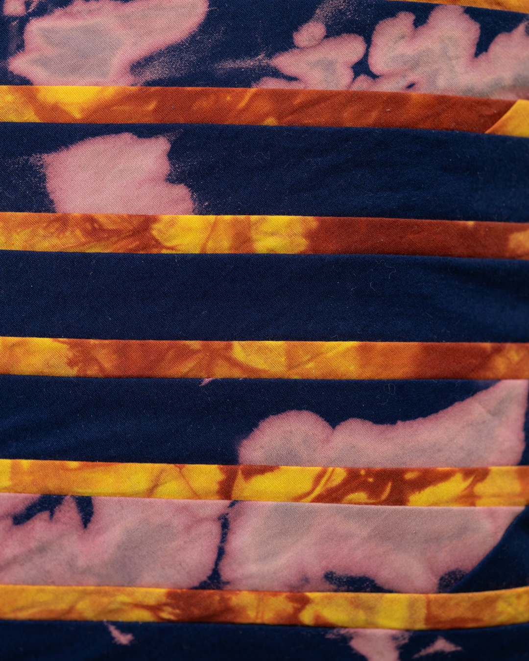 Built from a simple decision repeated carefully – stripe next to stripe, proportion after proportion – each piece pairs crisp stitched lines with subtle shifts in the dyed ground. Deep blue indigo alternates with warm earth tones inspired by the region’s iron-rich clay soil: gold-brown, sun-warmed, and grounded.