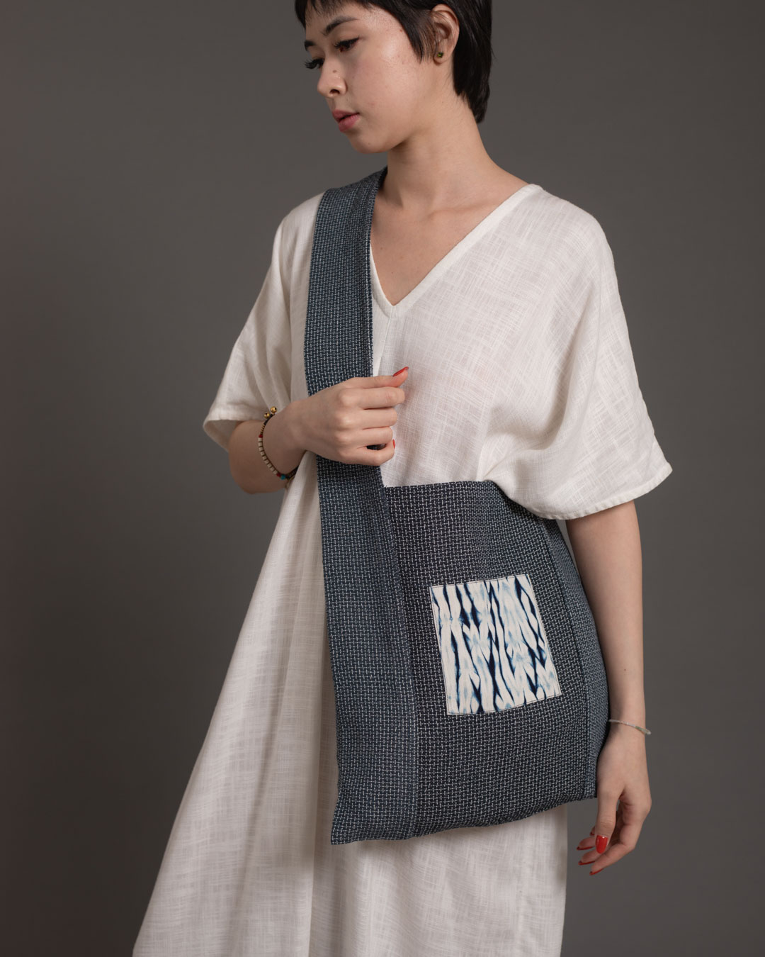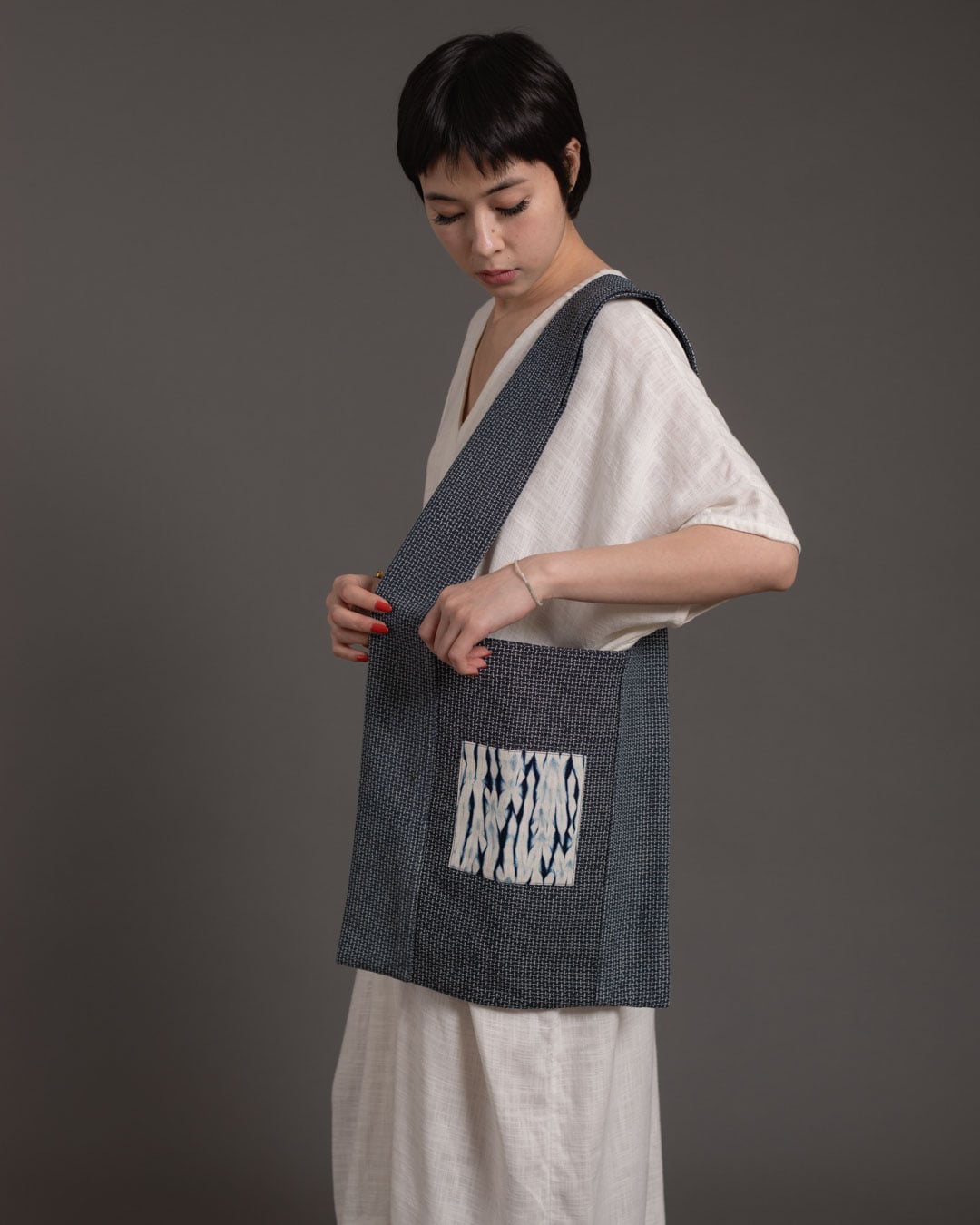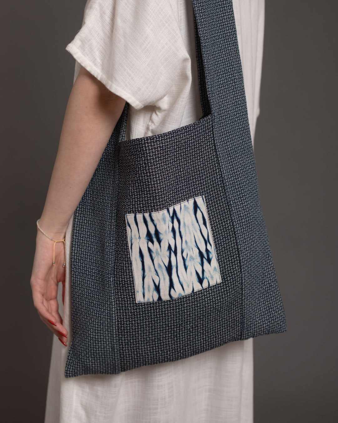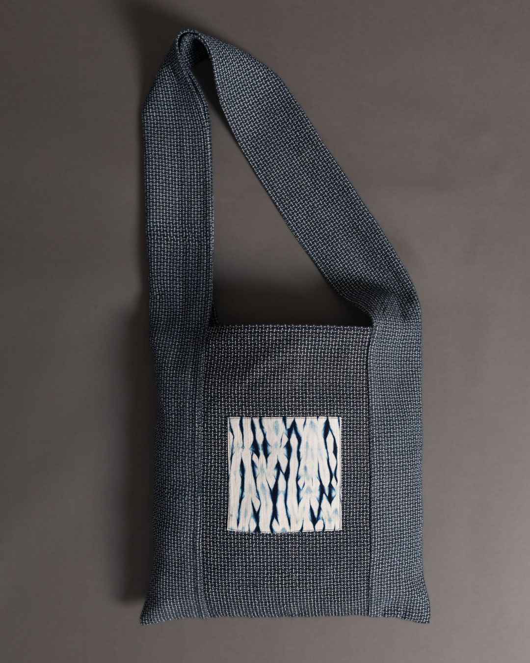 The process begins with drawing on the fabric to envision and plan out the design, followed by stitching, compressing and binding the fabric. Stitching and tying hundreds of threads by hand makes this an especially time intensive process which can take up to an entire week. In this phase, the fabric is intricately manipulated to create resist areas where the dye is unable to fully penetrate. The fabric is then immersed into indigo and/or non-toxic dyes which penetrates exposed areas while the bound sections resist, resulting in distinctive patterns.