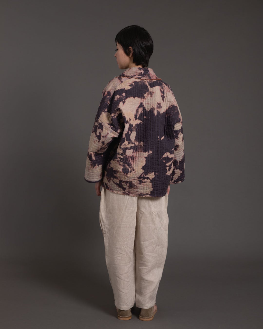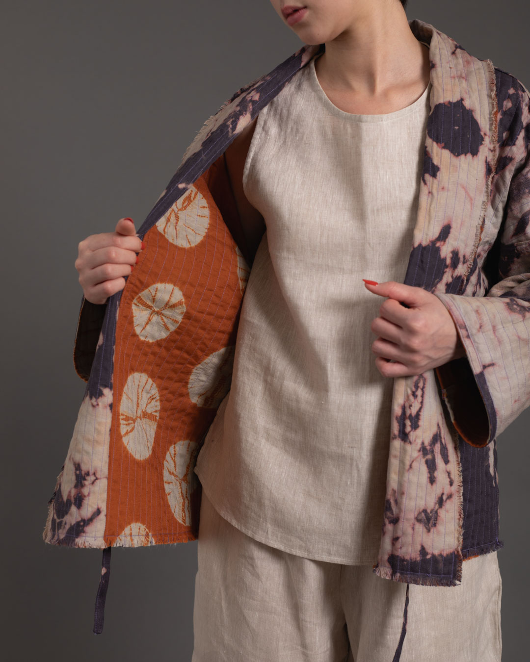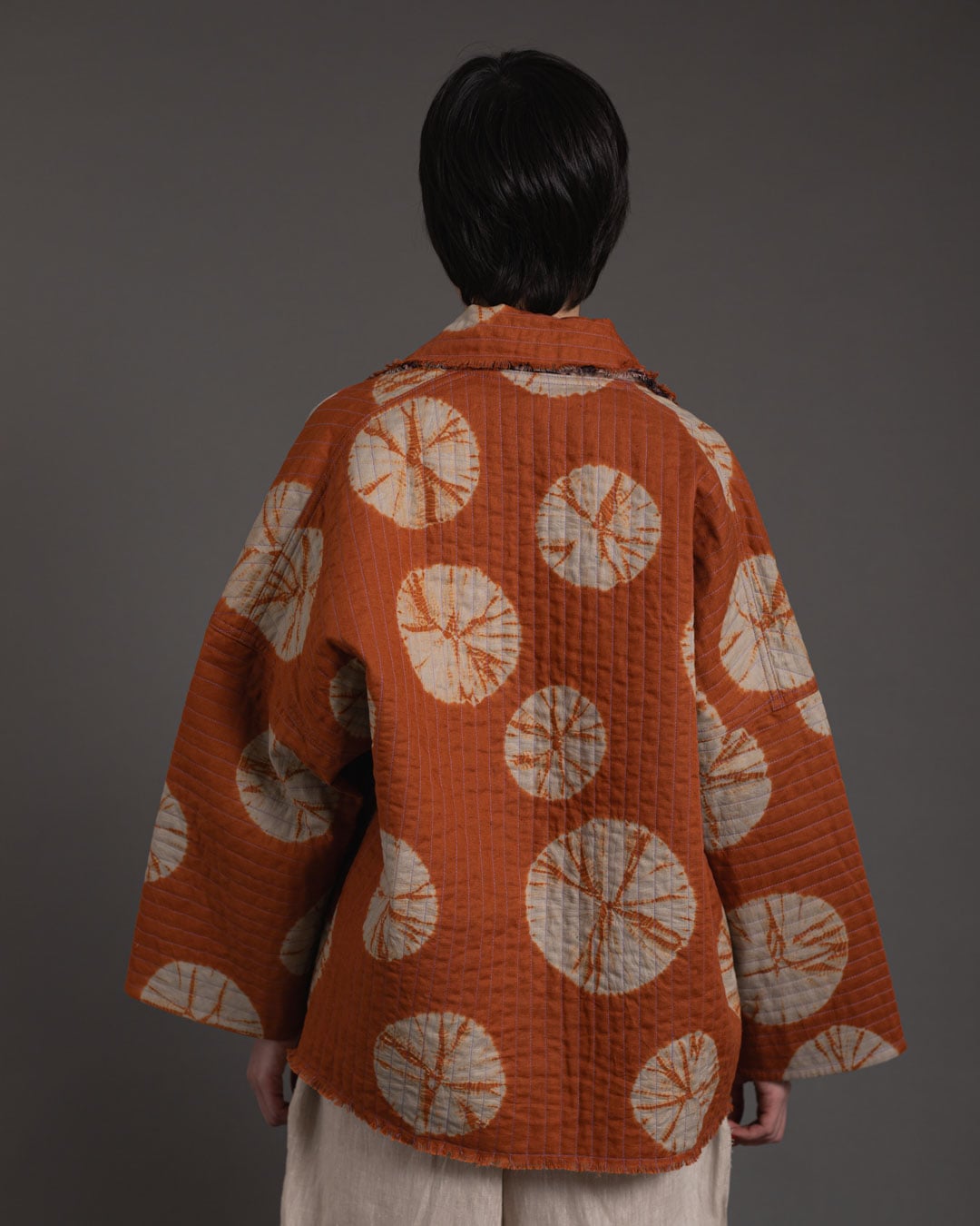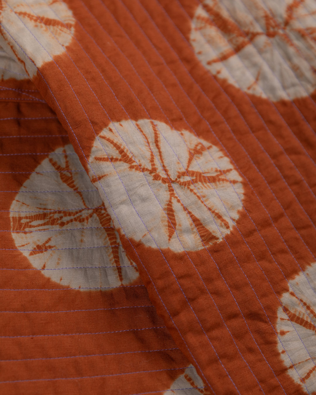 Shibori patterns are distinguished by soft, blurred edges, nuanced details, and subtle shade gradations. The uniqueness of these pieces lies in their countless minute variations. While the designs may initially appear structured, a closer look reveals the presence of human touch in every detail.