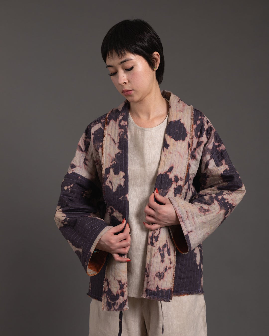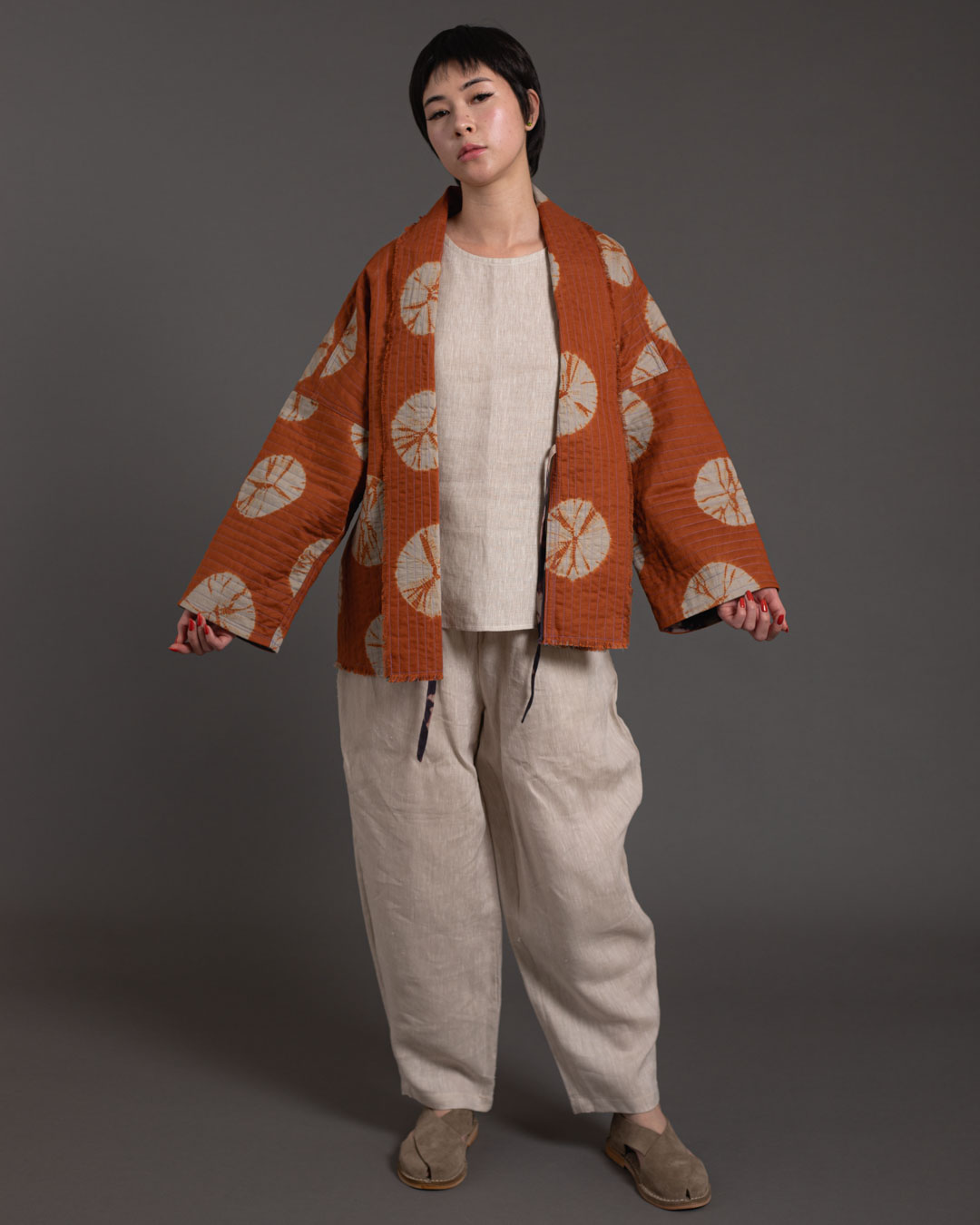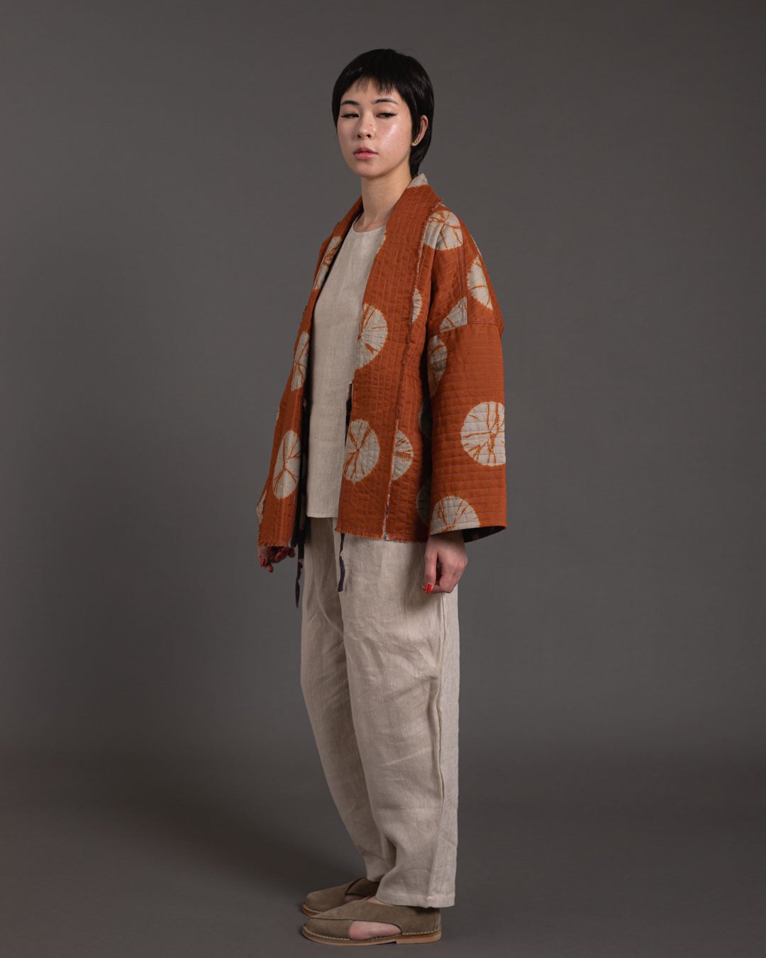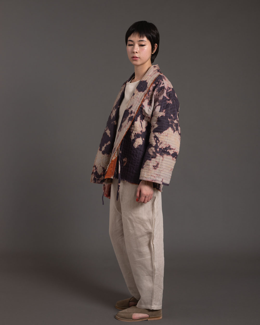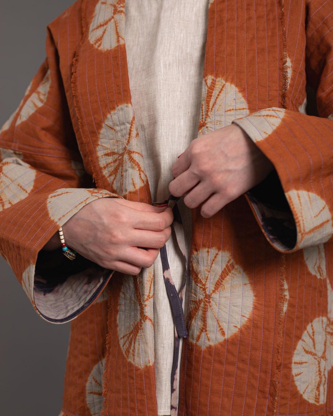 Shibori patterns are distinguished by soft, blurred edges, nuanced details, and subtle shade gradations. The uniqueness of these pieces lies in their countless minute variations. While the designs may initially appear structured, a closer look reveals the presence of human touch in every detail.