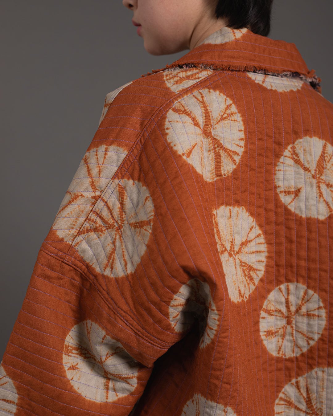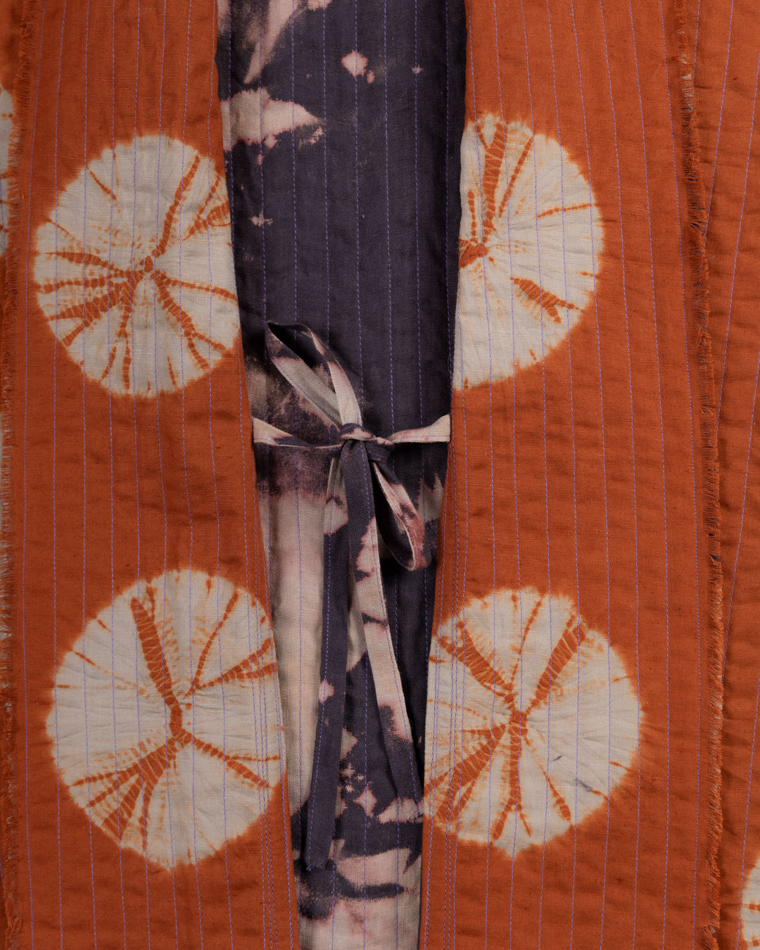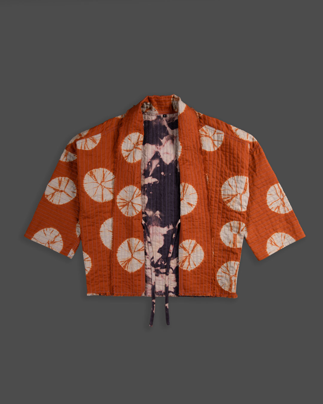 This piece showcases the intricate artistry of shibori, an ancient Japanese dyeing technique that involves manipulating and compressing cloth similar to tie-dye.