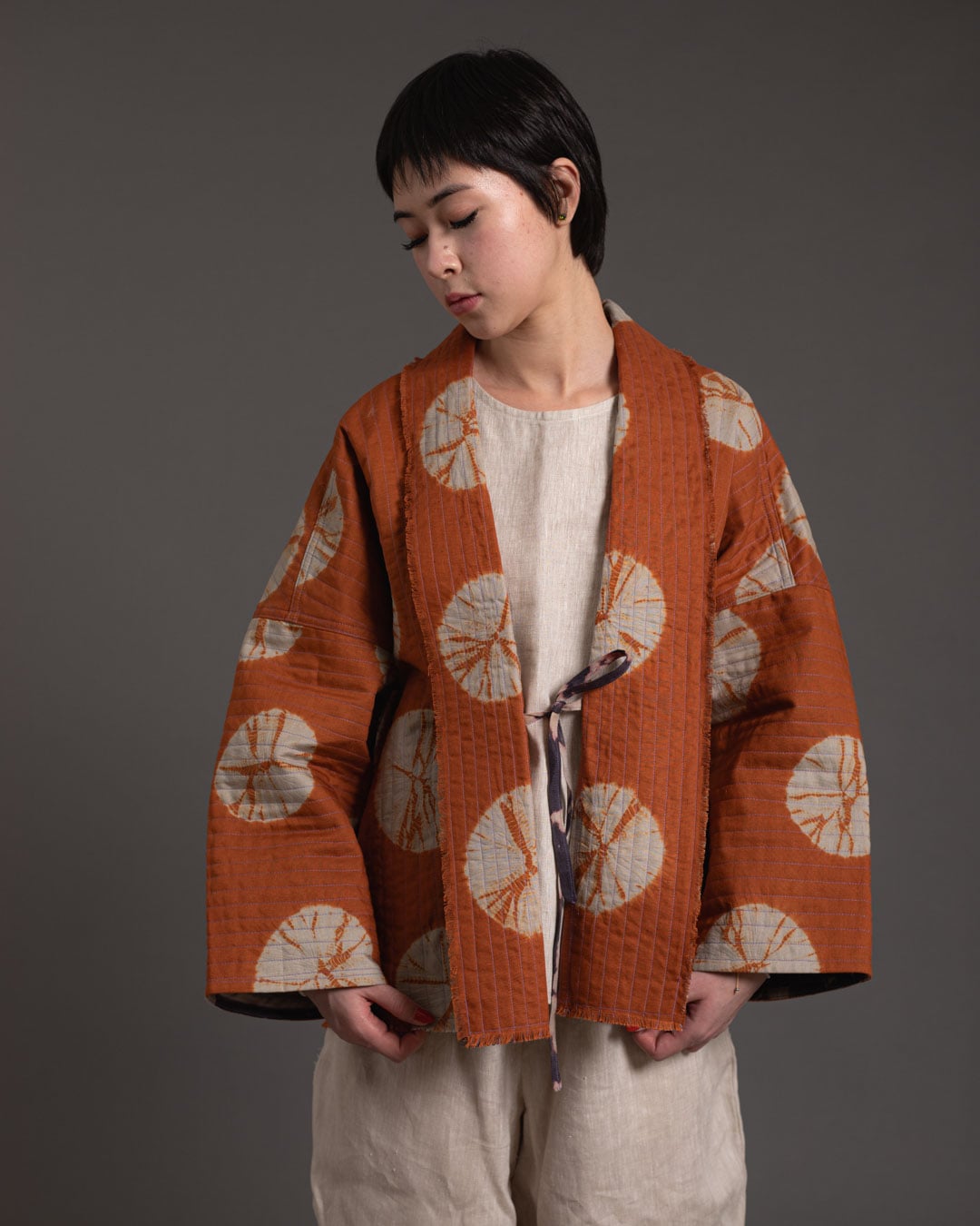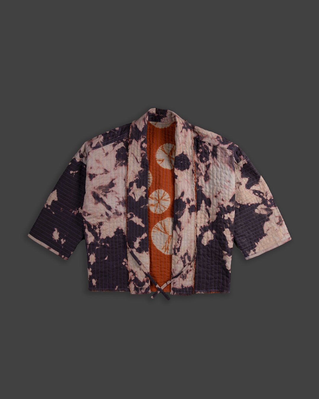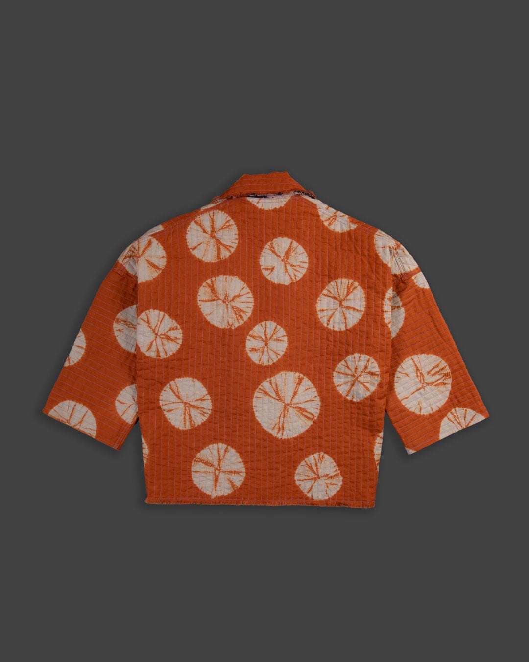 This piece showcases the intricate artistry of shibori, an ancient Japanese dyeing technique that involves manipulating and compressing cloth similar to tie-dye.