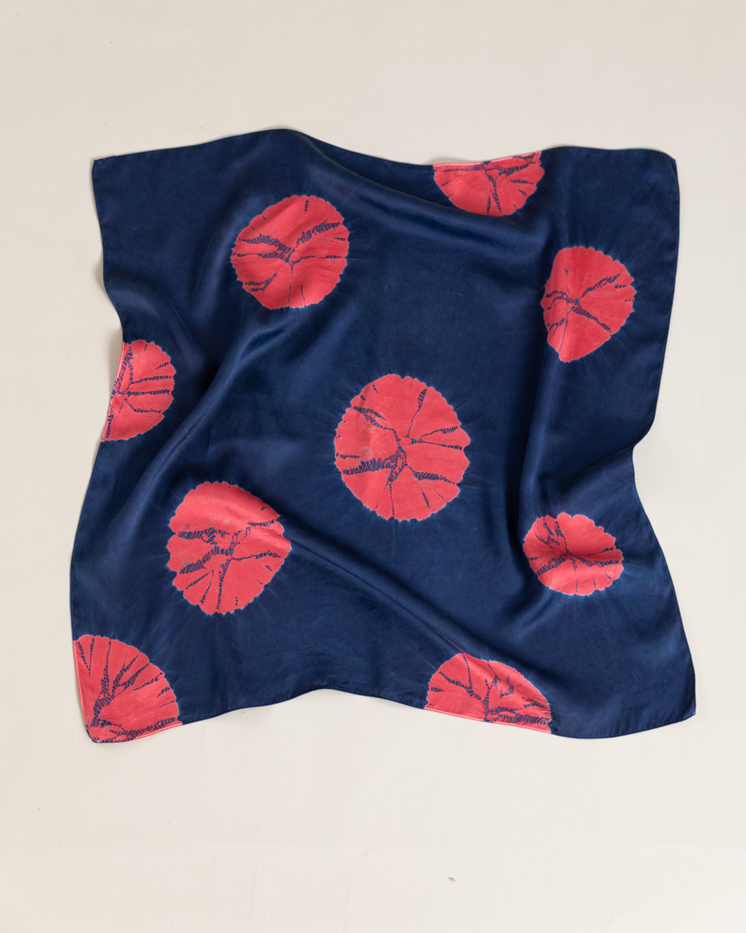 This piece showcases the intricate artistry of shibori, an ancient Japanese dyeing technique that involves manipulating and compressing cloth similar to tie-dye.