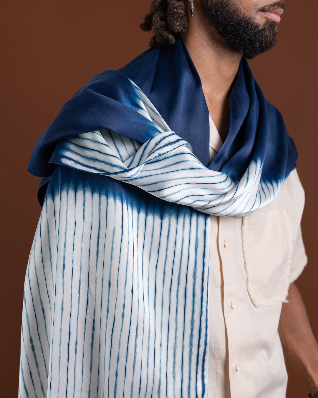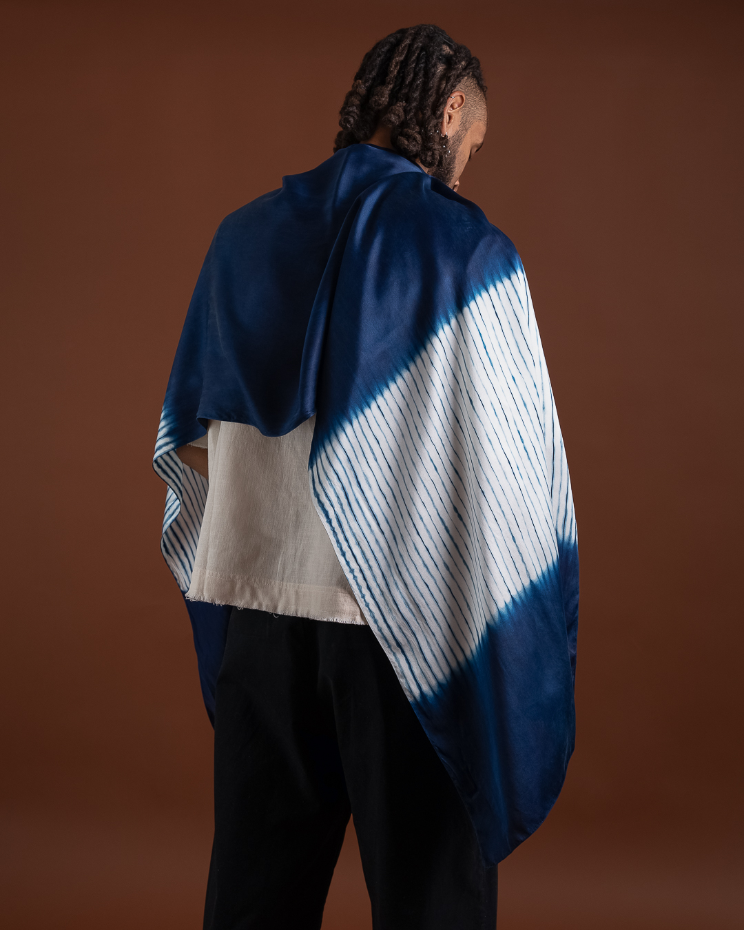 The process begins with drawing on the fabric to envision and plan out the design, followed by stitching, compressing and binding the fabric. Stitching and tying hundreds of threads by hand makes this an especially time intensive process which can take up to an entire week. In this phase, the fabric is intricately manipulated to create resist areas where the dye is unable to fully penetrate. The fabric is then immersed into indigo and/or non-toxic dyes which penetrates exposed areas while the bound sections resist, resulting in distinctive patterns.