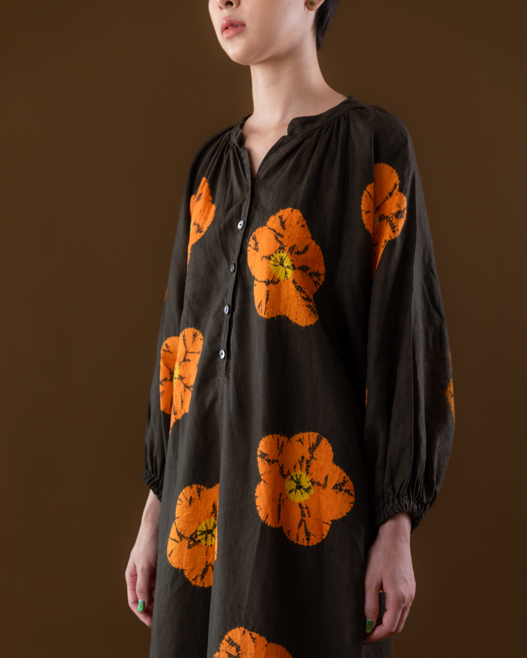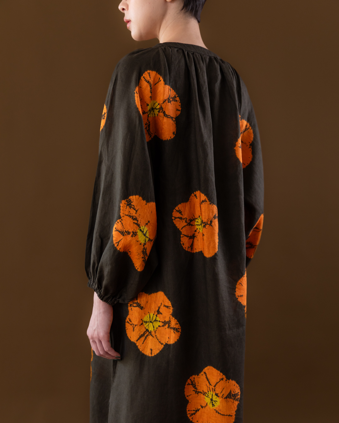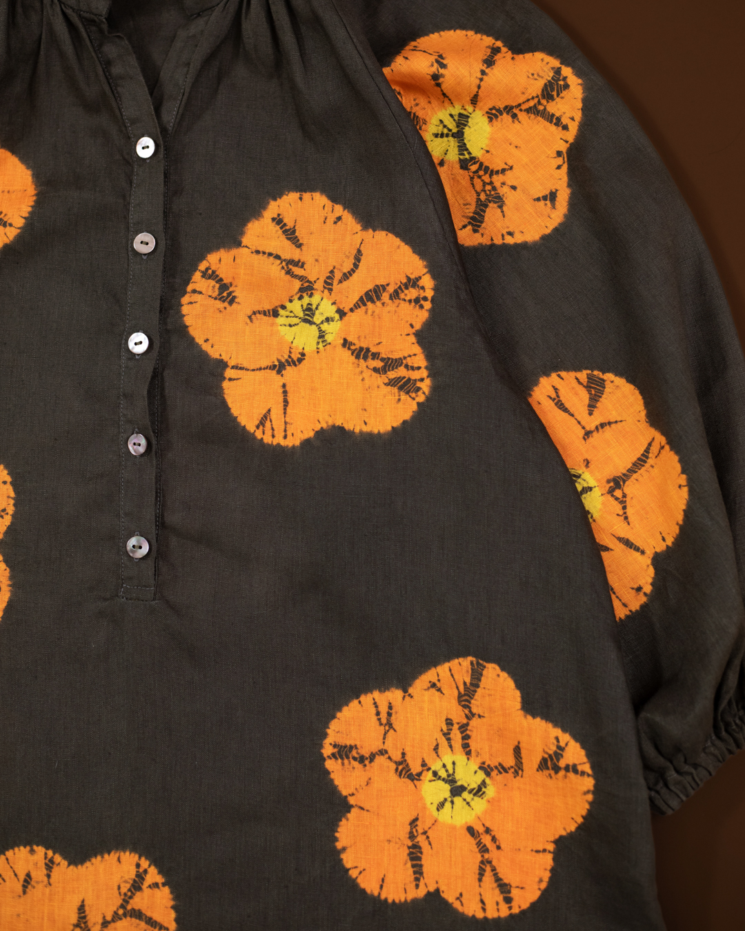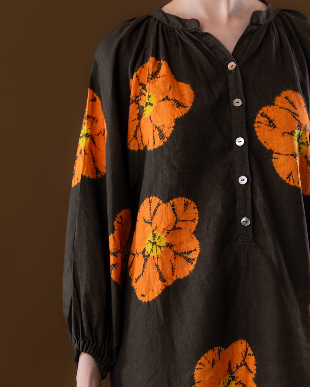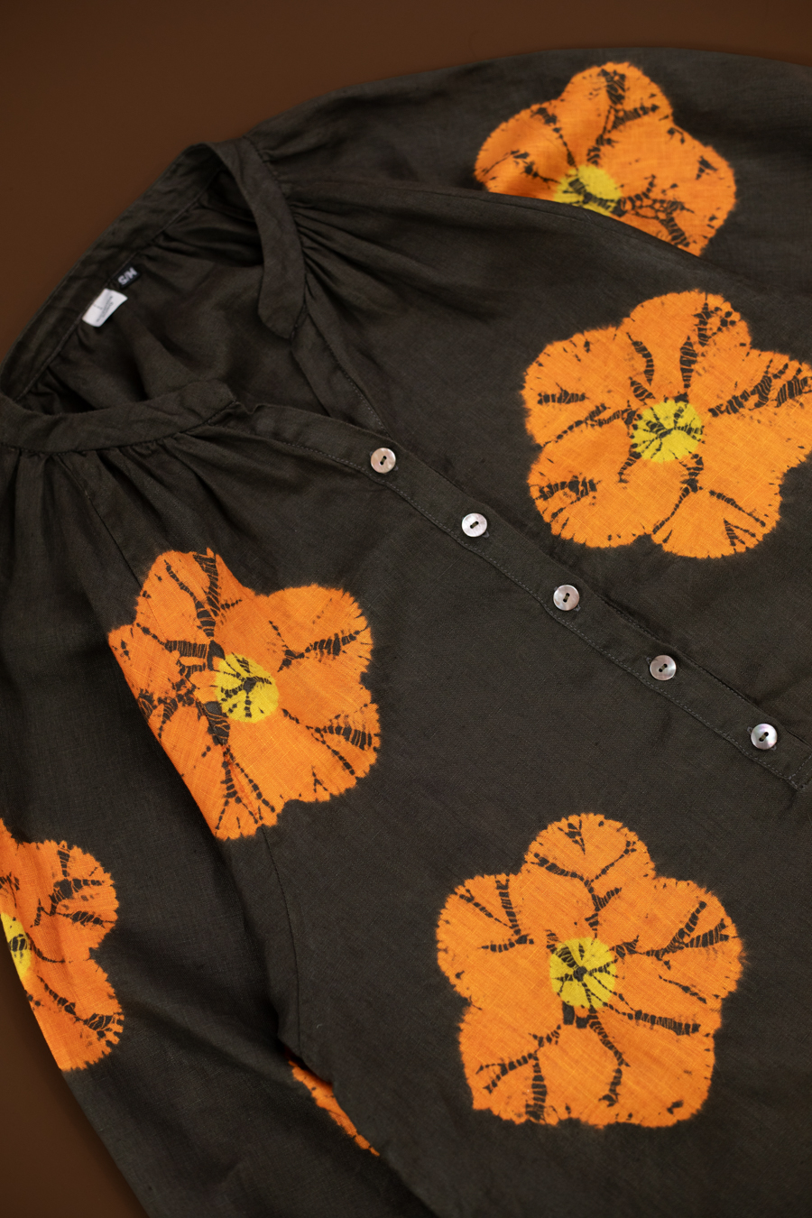 Shibori patterns are distinguished by soft, blurred edges, nuanced details, and subtle shade gradations. The uniqueness of these pieces lies in their countless minute variations. While the designs may initially appear structured, a closer look reveals the presence of human touch in every detail.