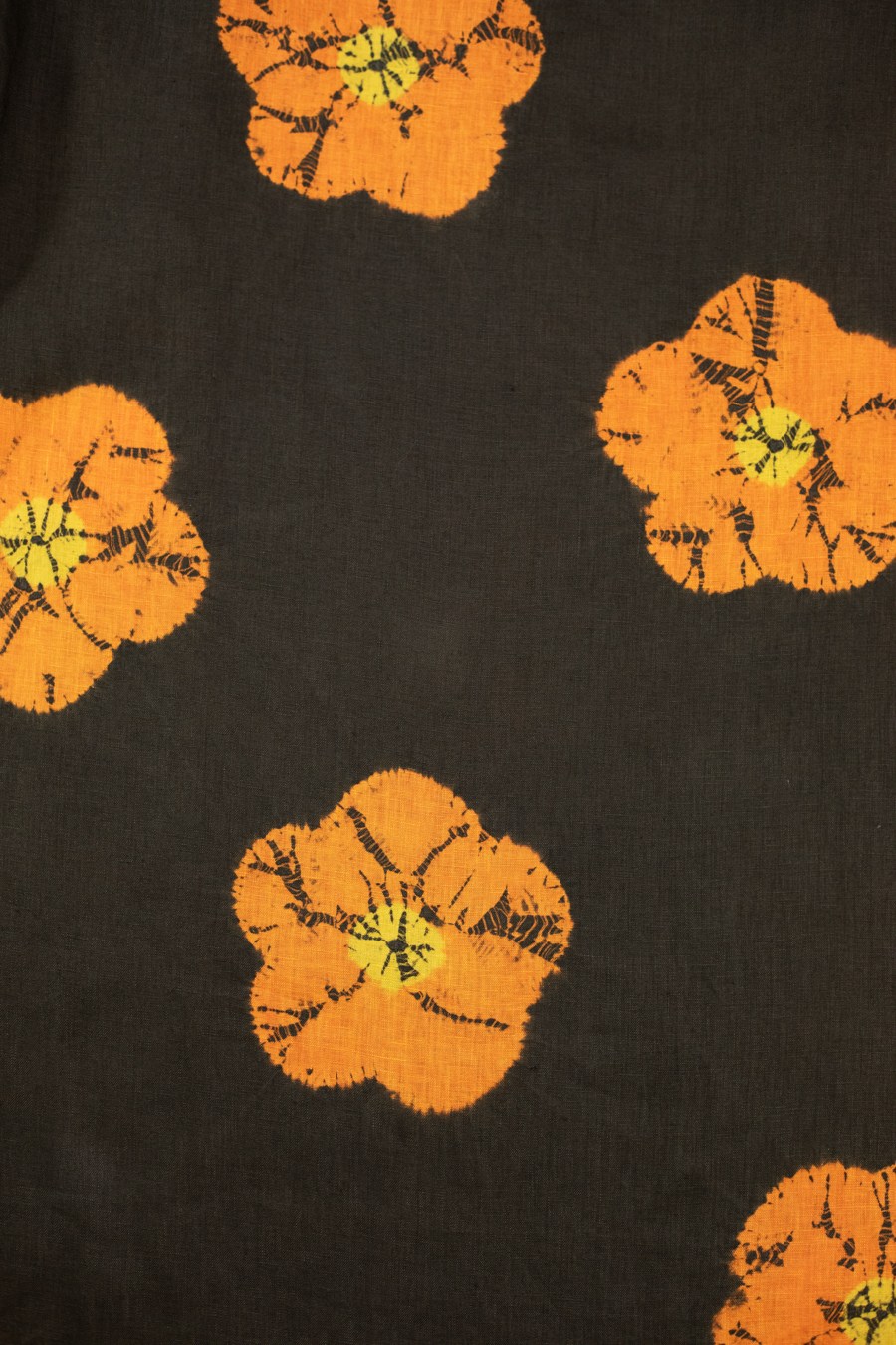 This piece showcases the intricate artistry of shibori, an ancient Japanese dyeing technique that involves manipulating and compressing cloth similar to tie-dye.