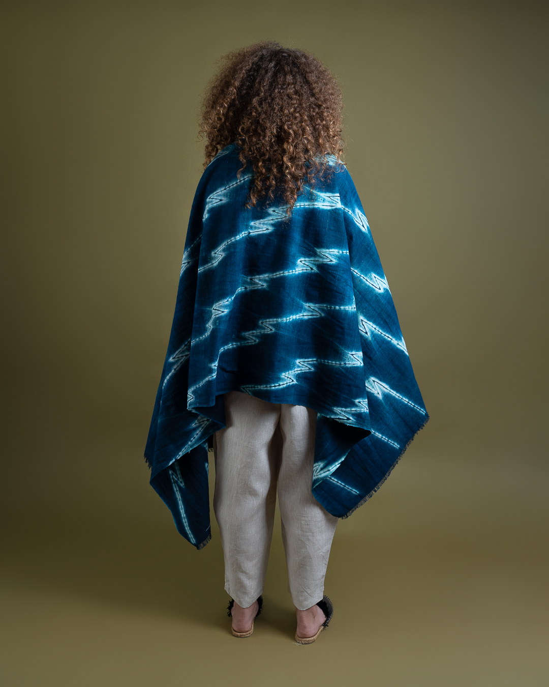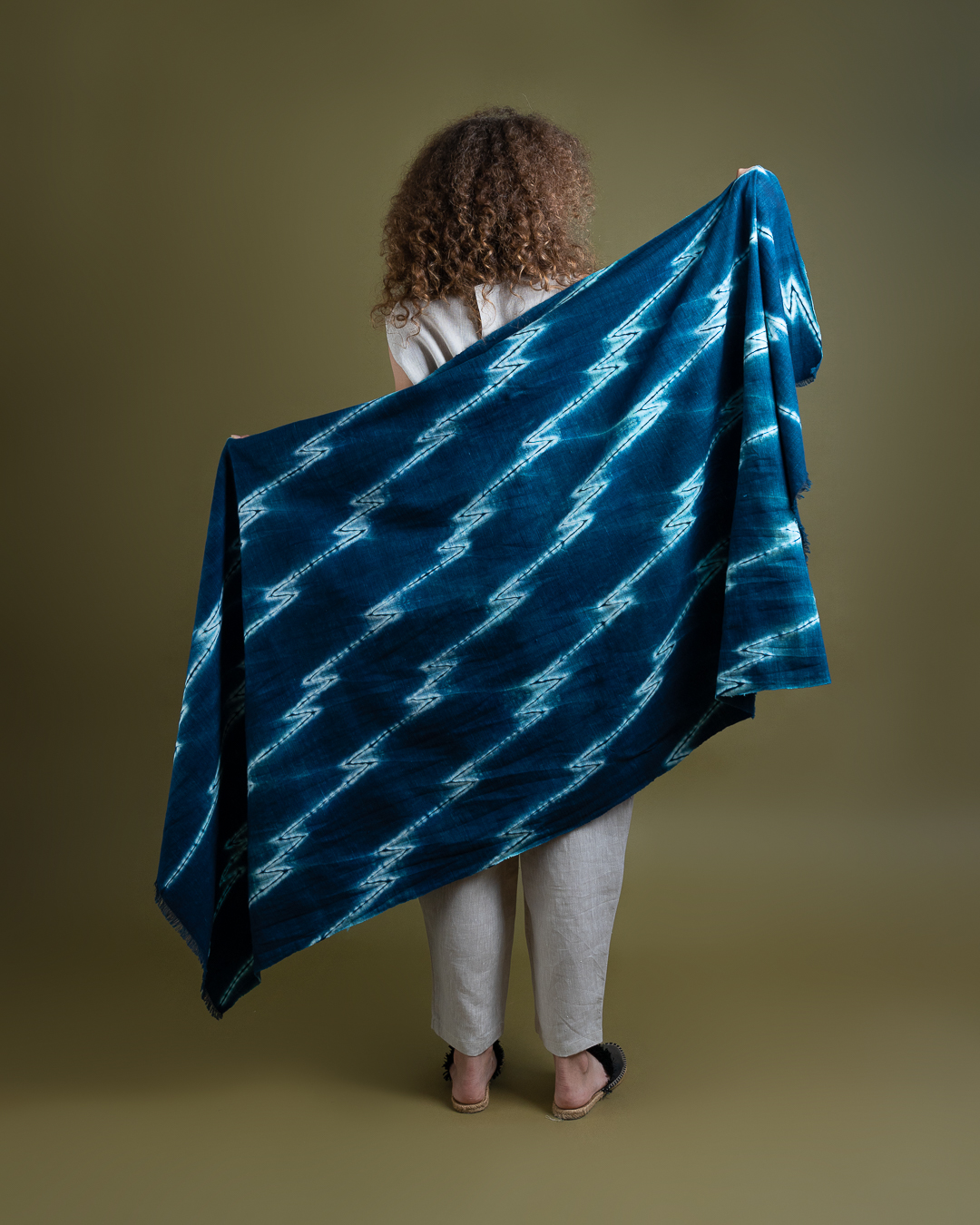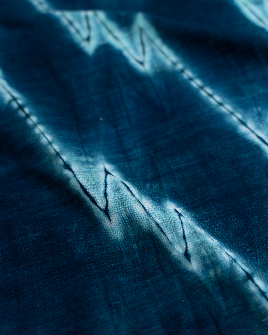 The process begins with drawing on the fabric to envision and plan out the design, followed by stitching, compressing and binding the fabric. Stitching and tying hundreds of threads by hand makes this an especially time intensive process which can take up to an entire week. In this phase, the fabric is intricately manipulated to create resist areas where the dye is unable to fully penetrate. The fabric is then immersed into indigo and/or non-toxic dyes which penetrates exposed areas while the bound sections resist, resulting in distinctive patterns.
