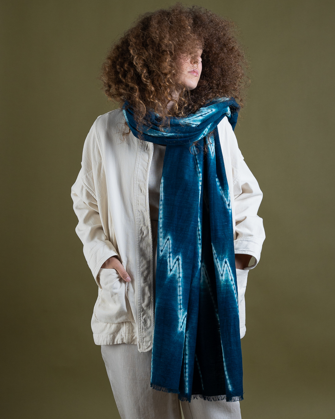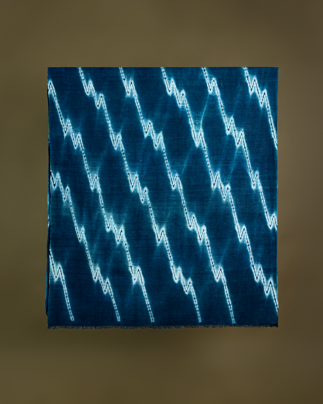 This piece showcases the intricate artistry of shibori, an ancient Japanese dyeing technique that involves manipulating and compressing cloth similar to tie-dye.