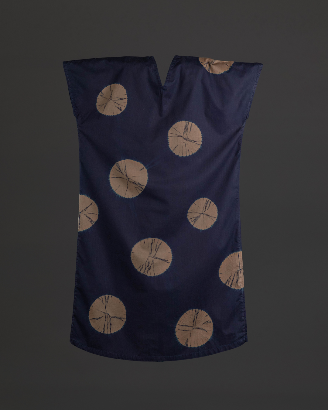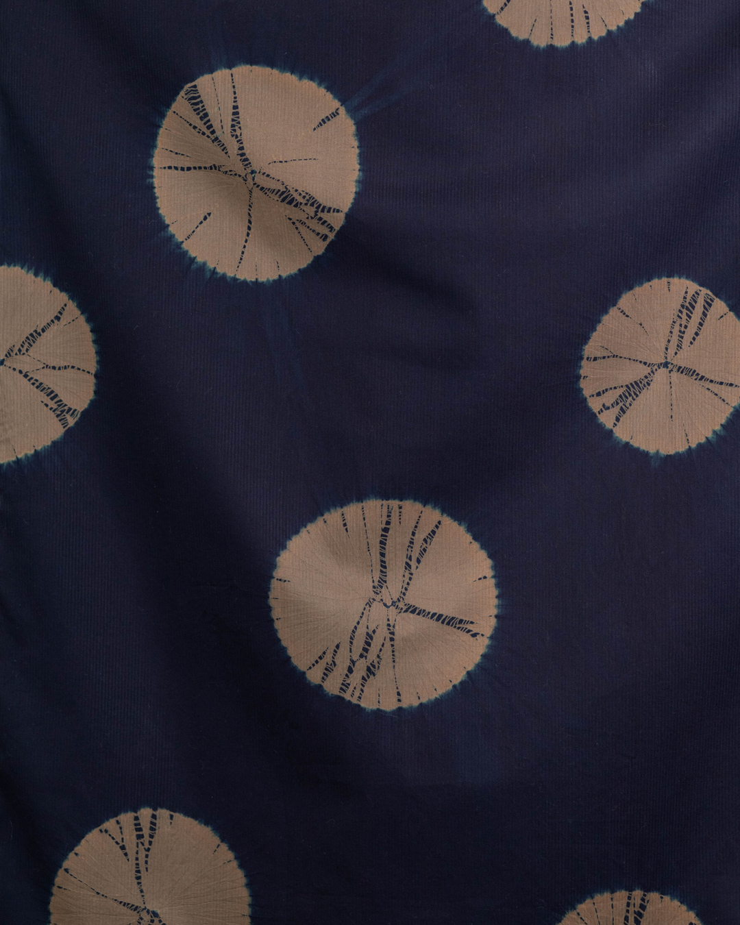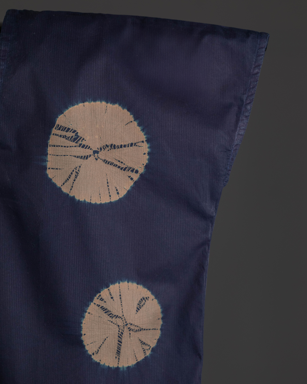 This piece showcases the intricate artistry of shibori, an ancient Japanese dyeing technique that involves manipulating and compressing cloth similar to tie-dye.