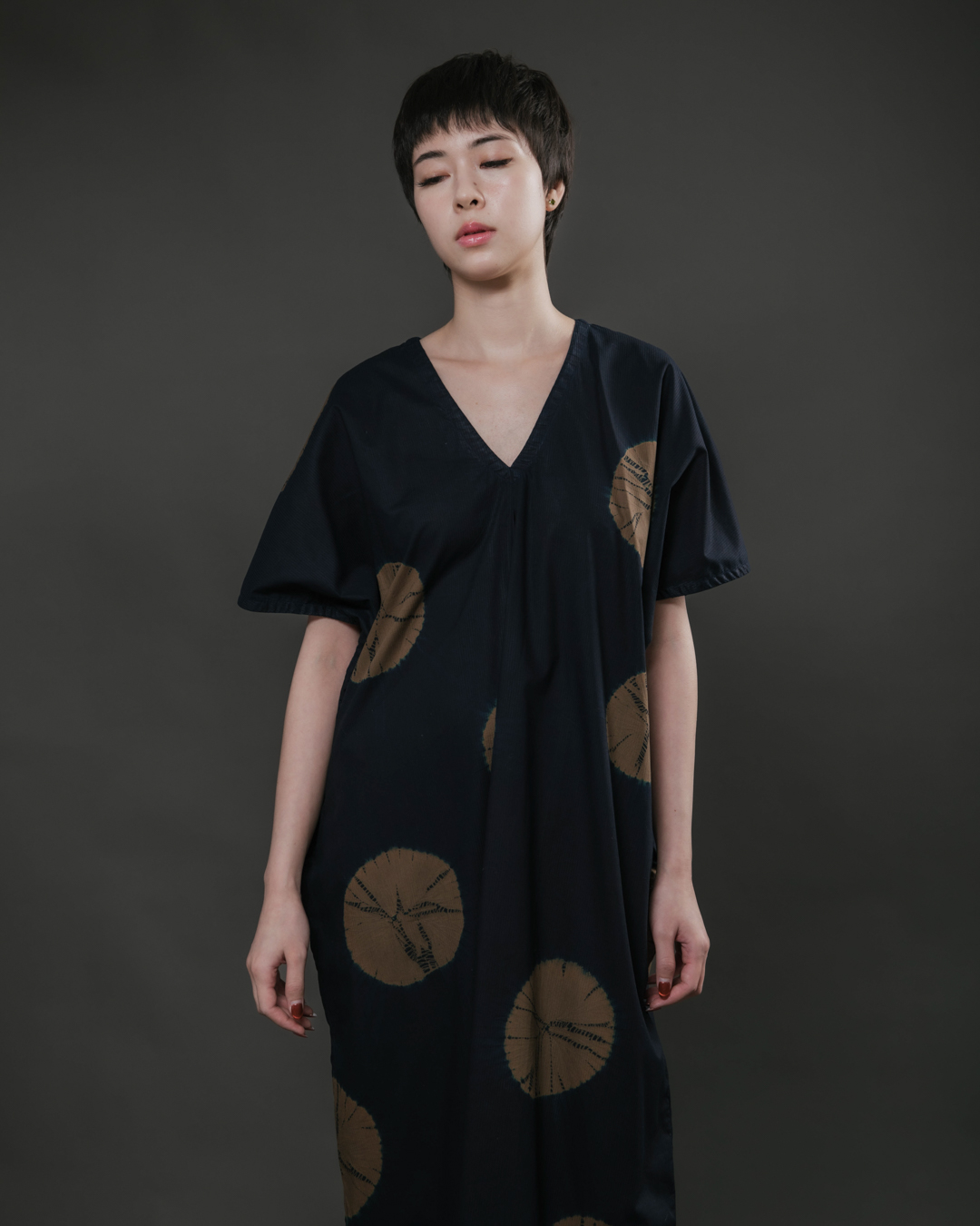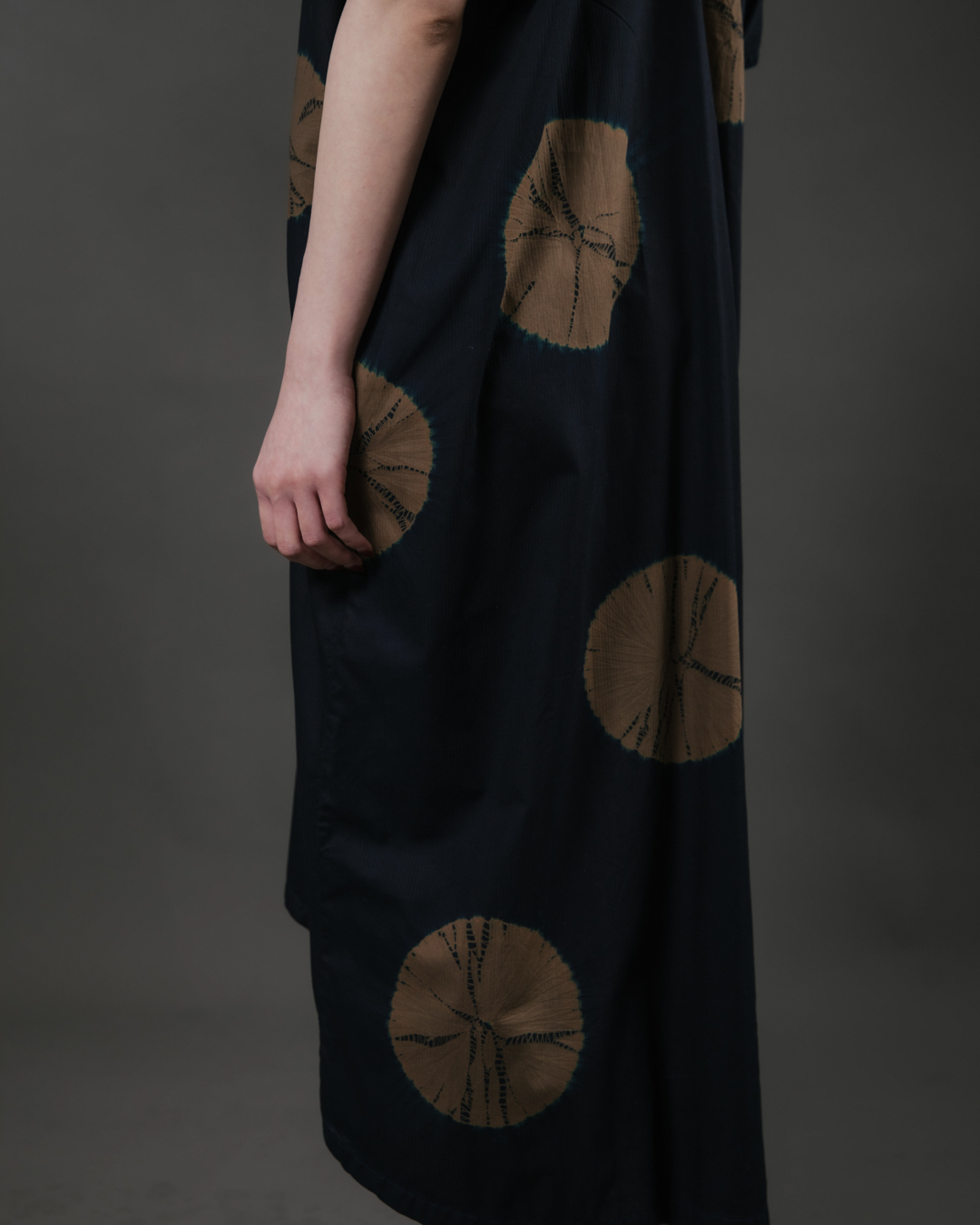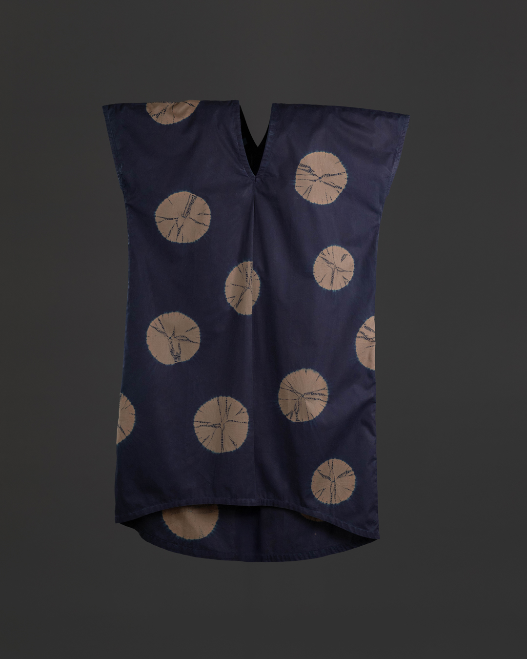This piece showcases the intricate artistry of shibori, an ancient Japanese dyeing technique that involves manipulating and compressing cloth similar to tie-dye.