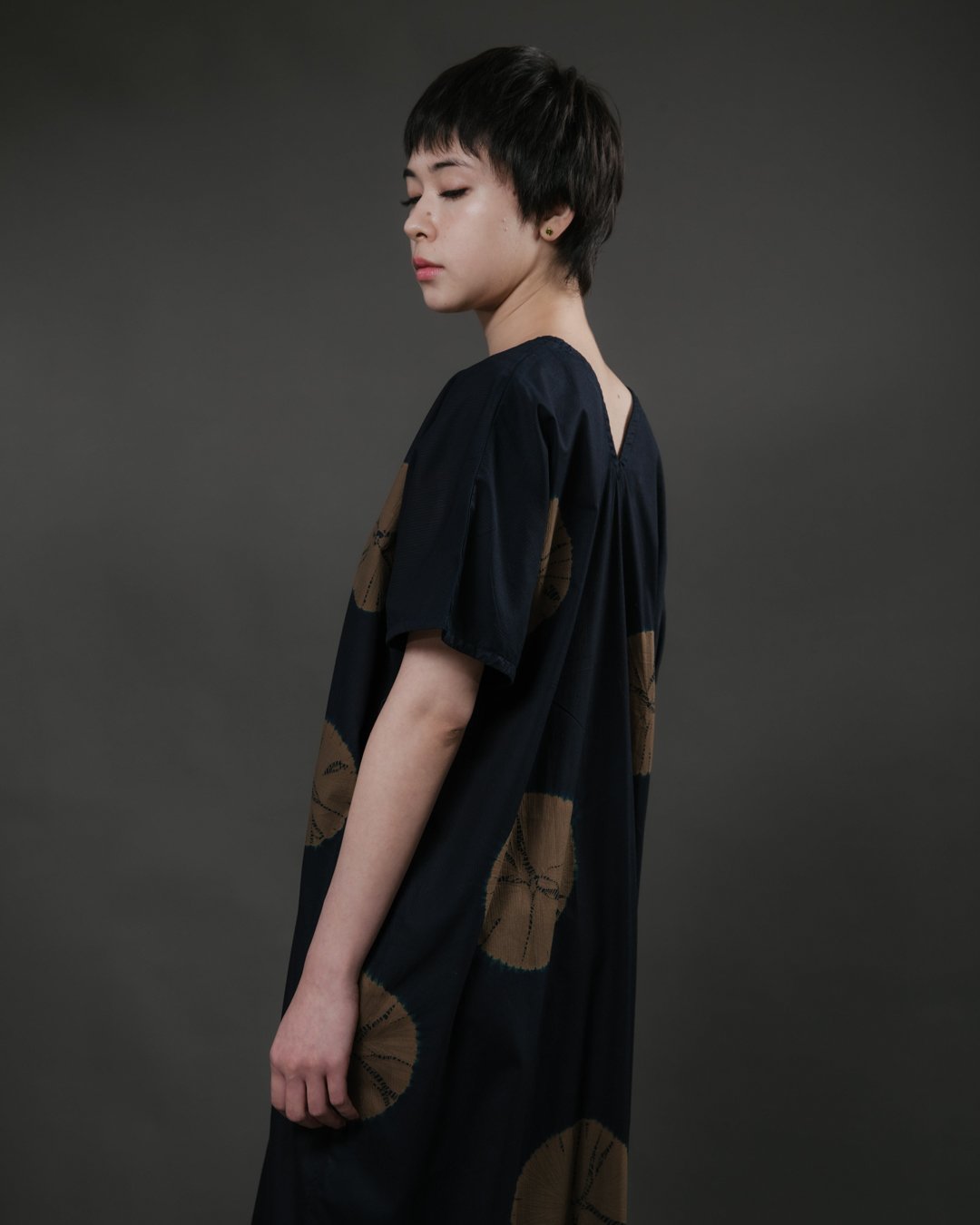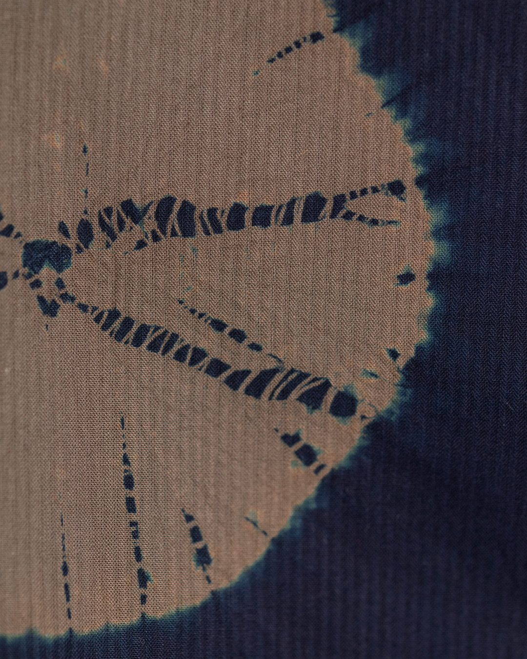 The process begins with drawing on the fabric to envision and plan out the design, followed by stitching, compressing and binding the fabric. Stitching and tying hundreds of threads by hand makes this an especially time intensive process which can take up to an entire week. In this phase, the fabric is intricately manipulated to create resist areas where the dye is unable to fully penetrate. The fabric is then immersed into indigo and/or non-toxic dyes which penetrates exposed areas while the bound sections resist, resulting in distinctive patterns.