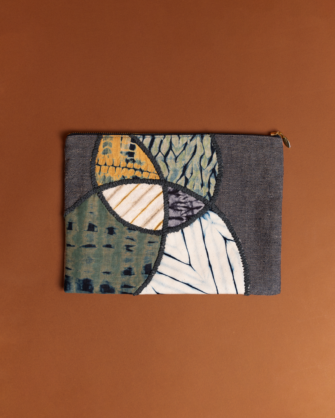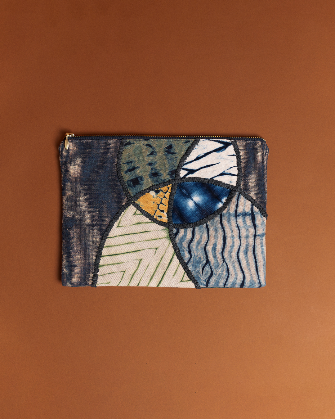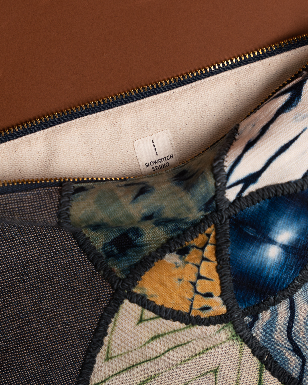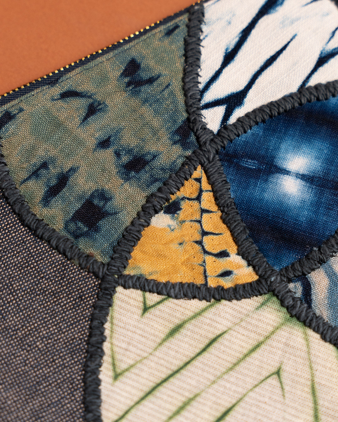 The process begins with drawing on the fabric to envision and plan out the design, followed by stitching, compressing and binding the fabric. Stitching and tying hundreds of threads by hand makes this an especially time intensive process which can take up to an entire week. In this phase, the fabric is intricately manipulated to create resist areas where the dye is unable to fully penetrate. The fabric is then immersed into indigo and/or non-toxic dyes which penetrates exposed areas while the bound sections resist, resulting in distinctive patterns.