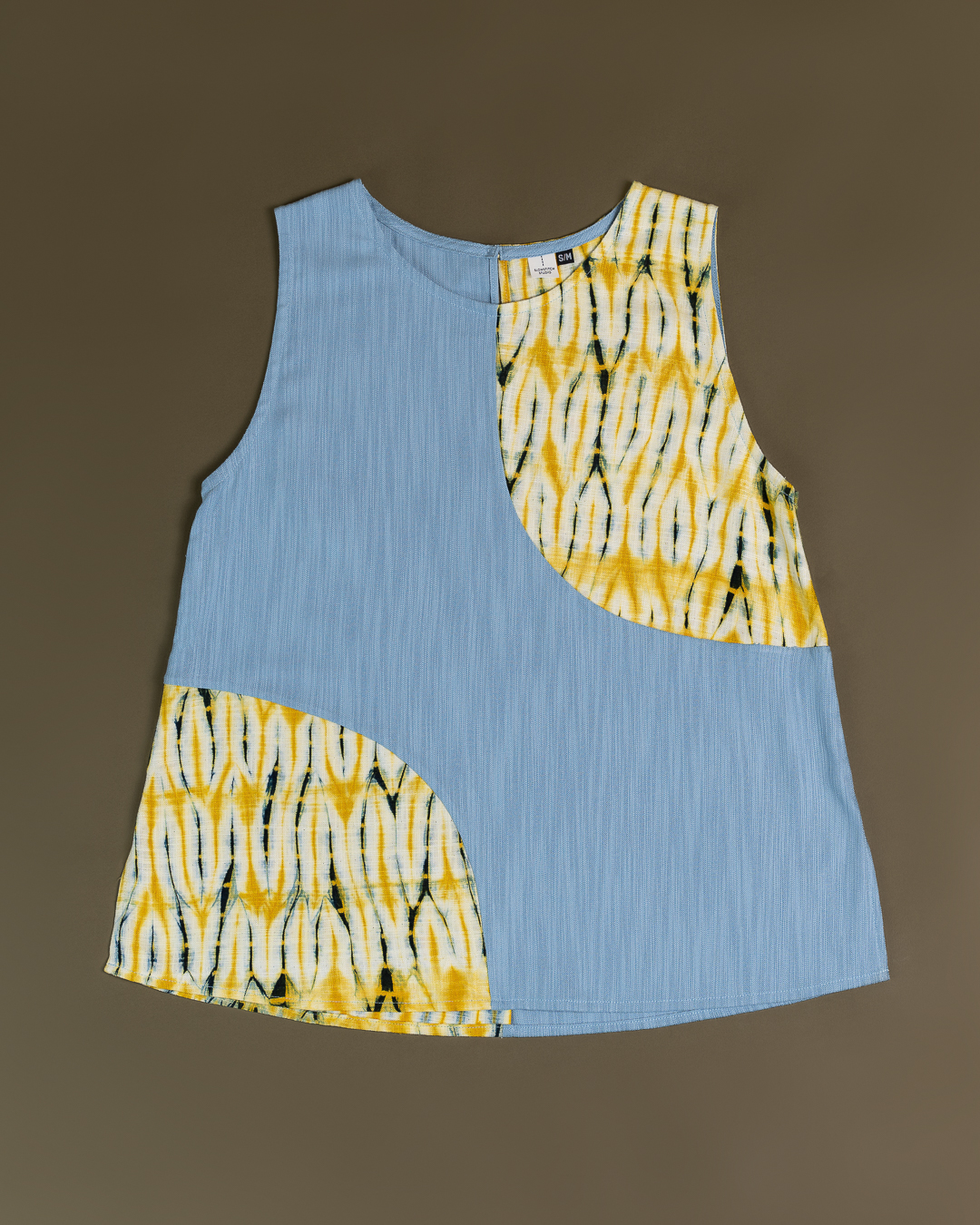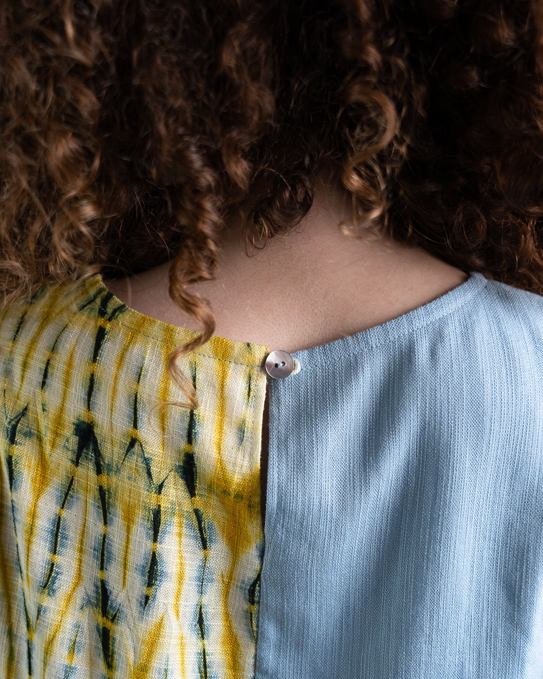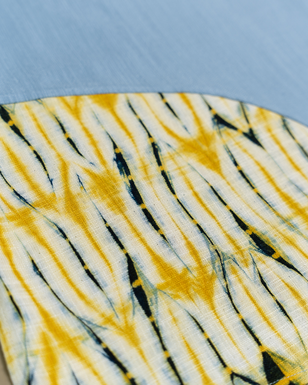 The process begins with drawing on the fabric to envision and plan out the design, followed by stitching, compressing and binding the fabric. Stitching and tying hundreds of threads by hand makes this an especially time intensive process which can take up to an entire week. In this phase, the fabric is intricately manipulated to create resist areas where the dye is unable to fully penetrate. The fabric is then immersed into indigo and/or non-toxic dyes which penetrates exposed areas while the bound sections resist, resulting in distinctive patterns.